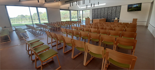 The Woodland Hall can also be arranged for smaller, more intimate gatherings around the catafalque. Whilst this arrangement works particularly well with a single row of chairs, an additional row can also be added, allowing accommodation for up to 32 attendees: